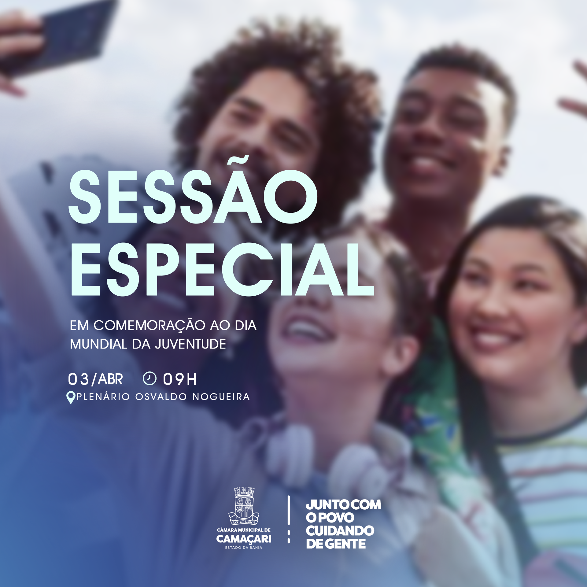 Acontece, na quarta-feira (03/04), a partir das 9h, no plenário da Câmara de Camaçari, a Sessão Especial em Comemoração ao Dia Mundial da Juventude, comemorado no dia 30 de março. A atividade foi solicitada pelo vereador Niltinho (PSDB), através do Requerimento Nº008/2024.