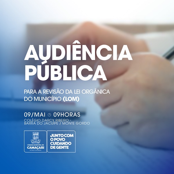 A Câmara de Camaçari encerra o ciclo de três audiências públicas sobre a revisão da Lei Orgânica Municipal (LOM), na próxima quinta-feira (09/05), com apresentação que acontece no Centro Educacional Darcy Ribeiro, em Barra do Jacuípe/Monte Gordo. A audiência pública acontece a partir das 9h, e contará com apresentação das mudanças sugeridas pelo Legislativo para a nova lei, que tem previsão de ser votada ainda este ano.