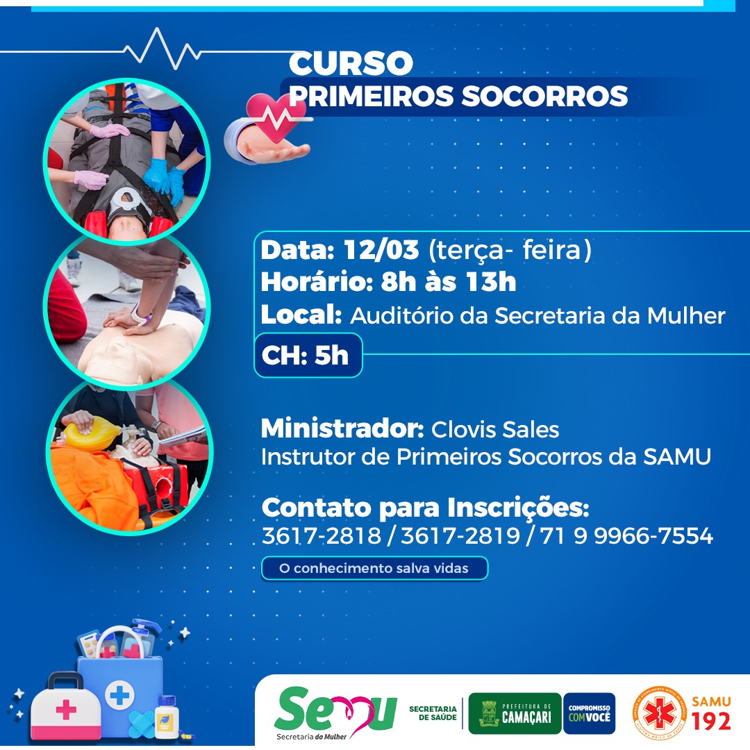 A Prefeitura de Camaçari, por meio da Secretaria da Mulher (Semu), em parceria com o Serviço de Atendimento Móvel de Urgência (SAMU 192), está com inscrições abertas, a partir desta quinta-feira (15/2), para o curso gratuito de primeiros socorros. Destinado ao público em geral, para participar o interessado deve ter idade mínima de 16 anos.